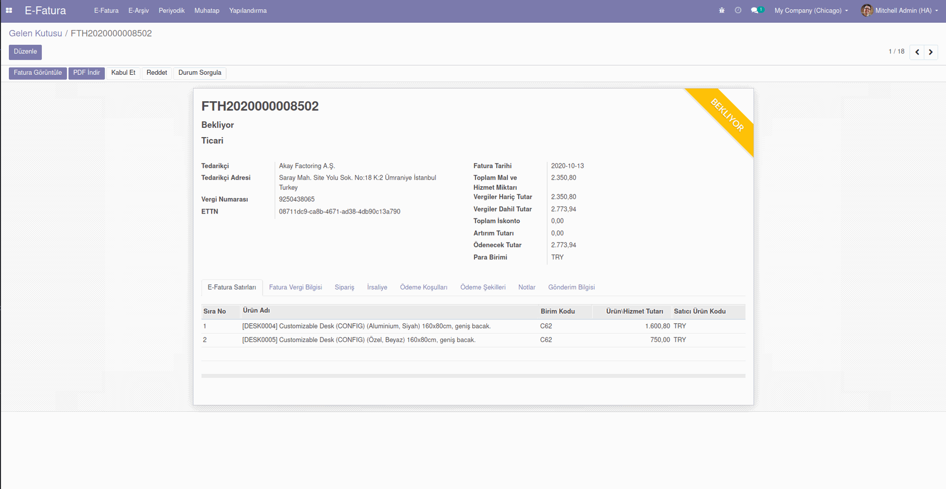 E-Fatura/E-Arşiv Modülünde kestiğiniz faturaları sistem üzerinden alıcıya ulaştırabilir sorgu çekebilir, son durumunu görüntüleyebilirsiniz. Odoo E-Fatura hakkında bilgi almak için tıklayınız.